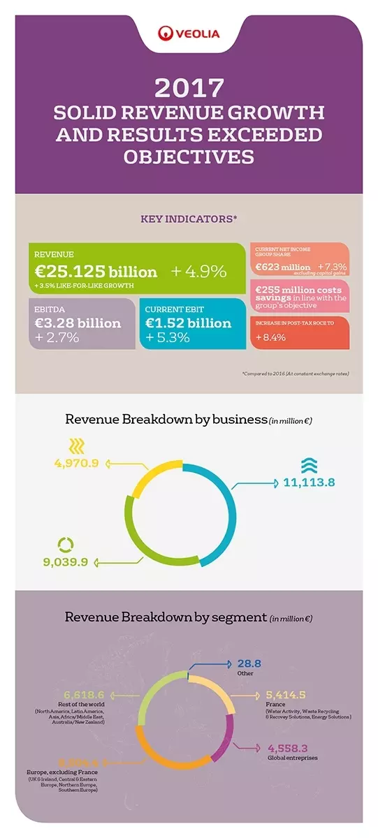 Antoine Frérot Antoine Frérot, Veolia’s Chairman & CEO indicated: «2017 has been an intense and successful year for Veolia and was fully in line with the growth trajectory we are aiming for. Sales growth accelerated throughout the year due to actions implemented at the end of 2016. Results growth was amplified quarter after quarter thanks to our commercial successes, and continued discipline on our part in terms of cost reductions. Over the last 4 years, EBITDA has risen by 20%, current EBIT by 75% and current net income has more than tripled. The sum total of these results allows me to approach 2018 with confidence. Revenue and earnings should again post good growth. Our 2018 and 2019 objectives are entirely confirmed.