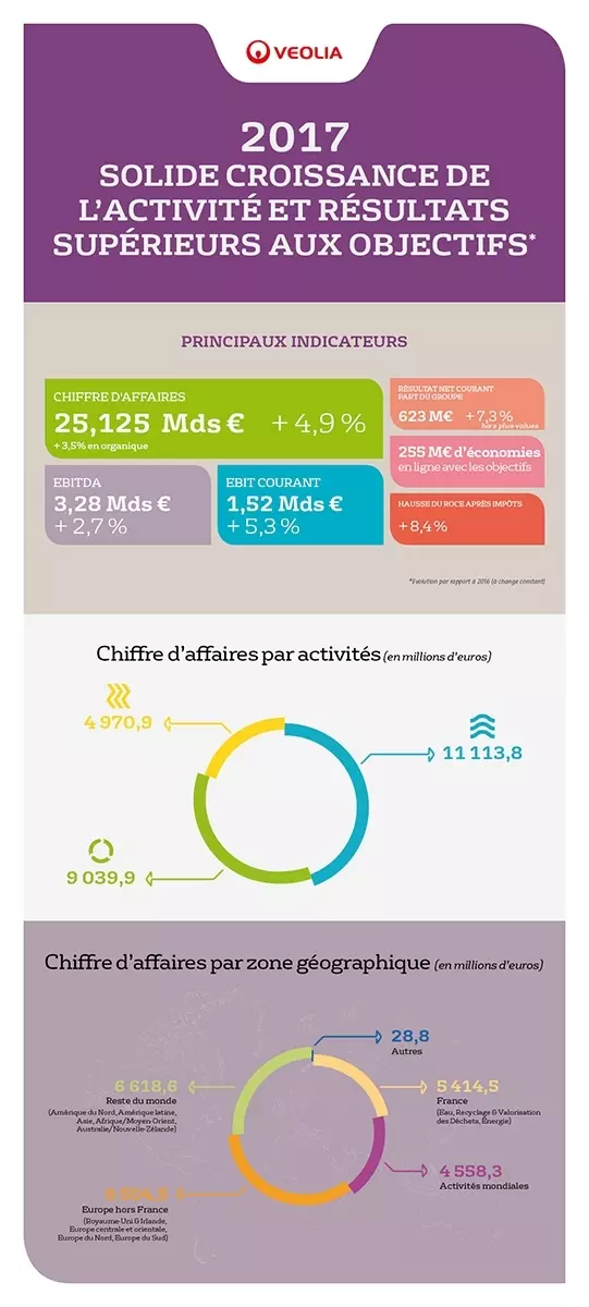 Antoine Frérot, Président Directeur Général du Groupe a indiqué : «2017 aura été une année intense et réussie pour Veolia. Elle s’inscrit pleinement sur la trajectoire de croissance que nous visons. La croissance du chiffre d’affaires s’est accélérée tout au long de l’exercice grâce aux actions mises en œuvre dès fin 2016. La croissance des résultats s’est amplifiée trimestre après trimestre grâce à nos succès commerciaux et à la poursuite de notre discipline en termes de réduction de coûts. Au cours des 4 dernières années, l’EBITDA aura ainsi progressé de 20%, l’EBIT courant de 75% et le résultat net courant part du groupe aura plus que triplé. L’ensemble de ces performances me permettent d’aborder 2018 avec confiance. L’activité et les résultats devraient de nouveau enregistrer une bonne croissance. Nos objectifs 2018 et 2019 sont entièrement confirmés.»